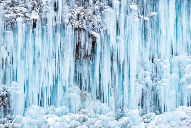真っ白に凍りついた氷瀑は、まるで自然が純白のドレスをまとったよう。冬の日差しを受けてきらめく無数の氷の粒は、息を呑むほどの美しさです♡