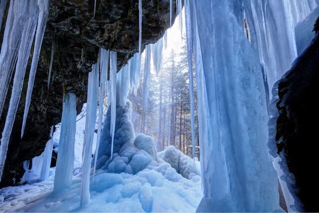 冬には流れ落ちる水が凍りつき、目の前に巨大な氷瀑が出現。洞窟の中から氷のカーテン越しに外の景色を眺めれば、光と氷が織りなす万華鏡のような世界が広がります♡