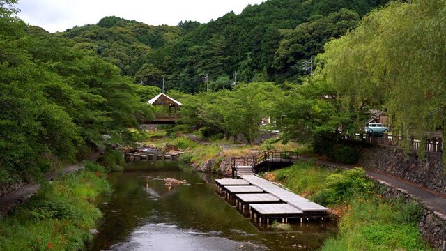 春の桜や秋の紅葉など四季折々の風景が楽しめ、初夏は新緑が美しいことで人気。周辺にある竹林の小径や修善寺自然公園は、絶景フォトスポットにおすすめです。川沿いには老舗の旅館が多く並ぶので、のんびり温泉旅行を満喫できますよ♪
