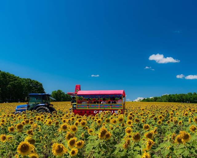 青空とピンクの観光トラクターとのコラボも素敵ですね♪