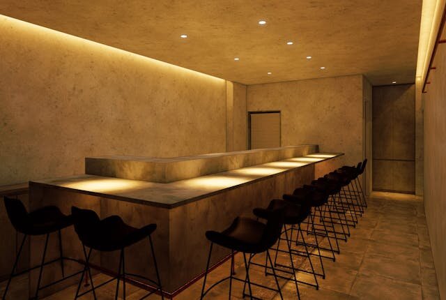 黒漆喰を使用した壁の店内は、映画館のようにほのかに灯りがともる空間。コの字カウンターに18席と4名用の個室が1つあります。