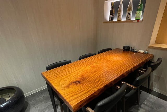 旧市街のお店らしく、落ち着いた雰囲気が特徴。寿司店のような一枚板のカウンターが目を引きます。テーブル席や個室は4~10名で利用可能なので、新年会や送別会にもぴったり!