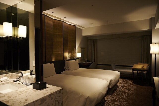 日本の伝統美と西洋のデザインが調和した「異文化の融合」をコンセプトに、屏風をモチーフにしたベッドボードや和紙の金箔アートなど、和の要素を取り入れた落ち着いたデザインが特徴です。