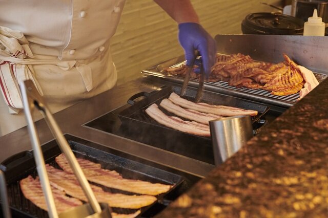 ライブキッチンでは、シェフがスペイン原産のイベリコ豚を贅沢に厚切りカットしたベーコンやソーセージなどを目の前で焼き上げます。