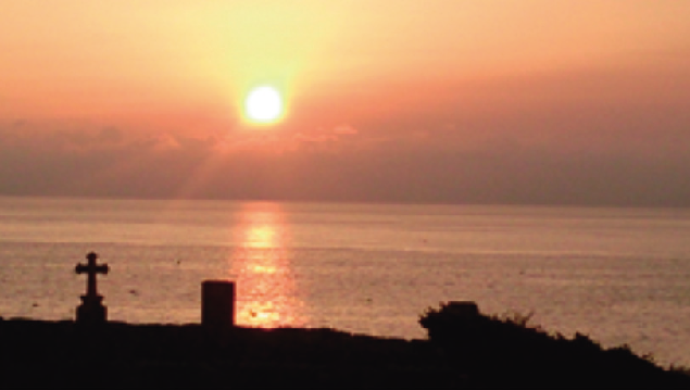墓標などをバックに海が夕日で染まる景色は絶景です。