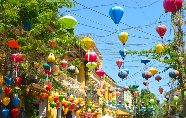 古い街並みが色濃く残る旧市街にはベトナムの雑貨店やレストランが軒を連ね、頭上にはカラフルなランタンが揺れる様子が広がり、ノスタルジックな情景です。夜になると、街中のランタンの灯りがともり、幻想的な雰囲気に。トゥボン川での灯篭流しも、心に残る素敵な体験となることでしょう。