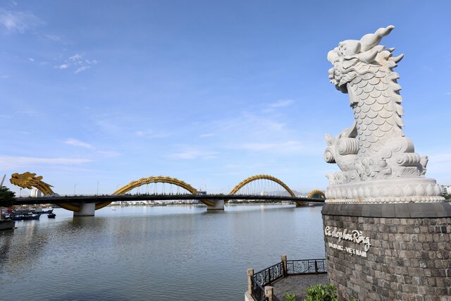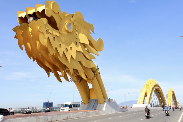 ドラゴンのデザインがひときわ目を引く、全長666mの橋です。ダナンの中心部を流れるハン川に架かり、市街地とビーチエリアを結んでいます。夜はライトアップされ、色鮮やかに変化する姿を楽しめます。