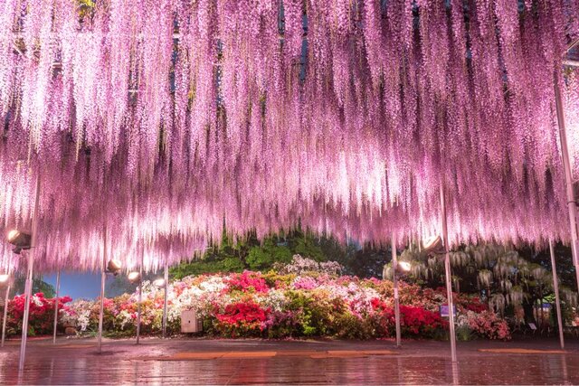 見どころは、日本最大規模を誇る巨大な藤棚。畳600枚もの大きさで、迫力満点の姿を体感できます。特に、ライトアップされた景色は息を飲む美しさです♡