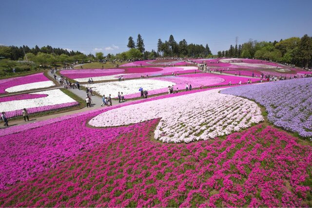 4月中旬〜5月上旬がベストシーズンなので、ゴールデンウィークの時期まで楽しむことが可能。小高い丘から見下ろすと、まるで色とりどりの絨毯を見ているような気分に♪芝桜で描いた花模様も必見です!