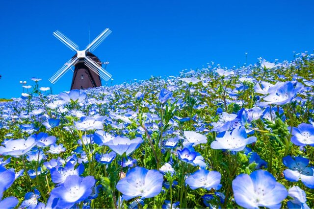 ゴールデンウィークの時期にはネモフィラが満開となり、あたり一面が青色の絶景に!都会の中にいながら、手軽に自然と触れ合えますよ♡