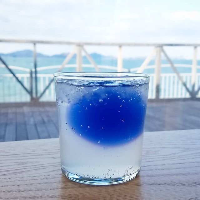 不思議な青い球体は太いストローでつぶしてみると、塩レモンゼリーらしくさっぱりとした味わい。