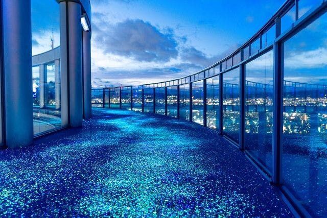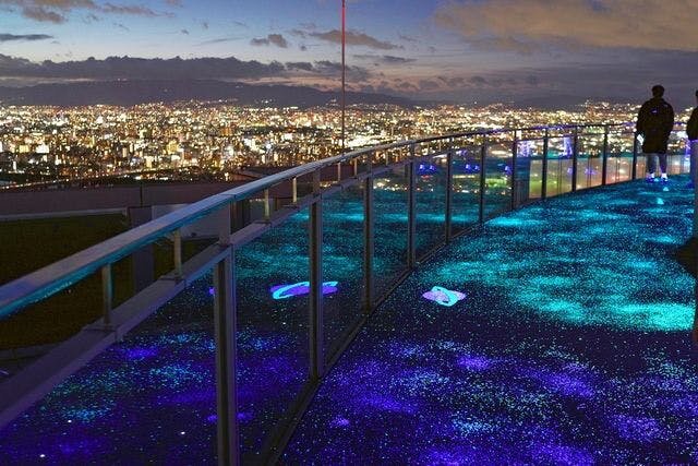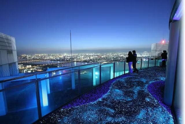 日中はさわやかな風を感じながら大阪市内を見渡せ、夜になると足元にキラキラと輝く光の道「ルミ・スカイ・ウォーク」が現れ、目の前の夜景と共に、幻想的な世界に包まれます。