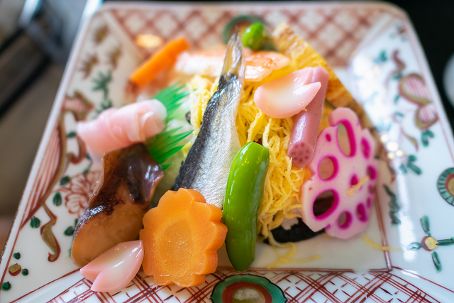 岡山を代表する郷土料理「ばら寿司」は瀬戸内海の海の幸と旬の野菜を華やかに盛りつけたお寿司です。