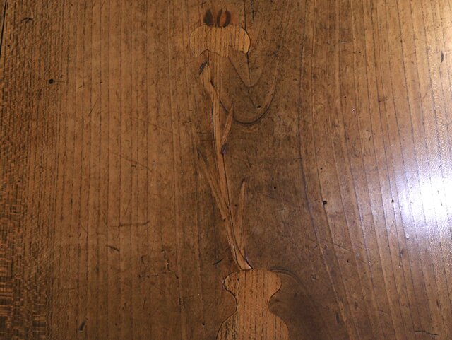 本堂の大廊下の床を見ると、板の節穴や割れ目にひょうたんや木の葉、アヤメ、アケビ、船などの形をした木片をはめ込まれています。