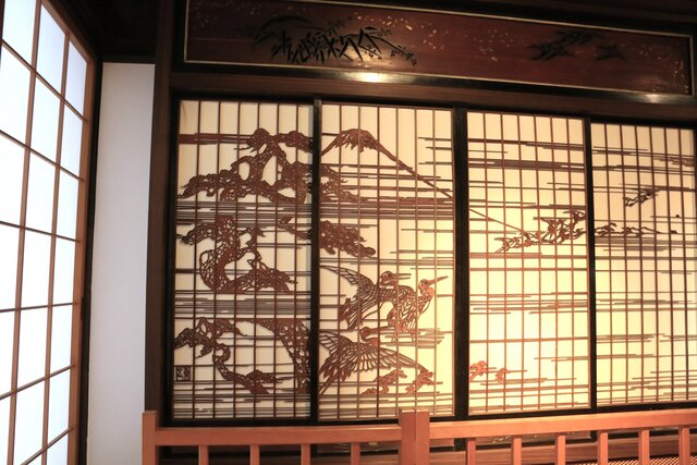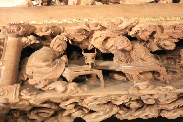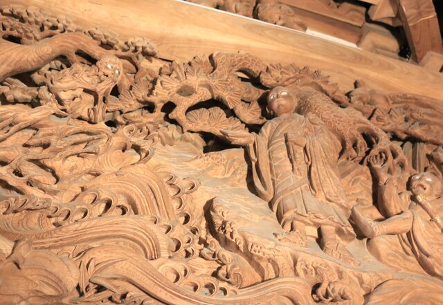 欄間彫刻は分厚い一枚の板を深く彫り込み、遠近法が用いられて奥行きを感じさせる技巧が凝らされています。