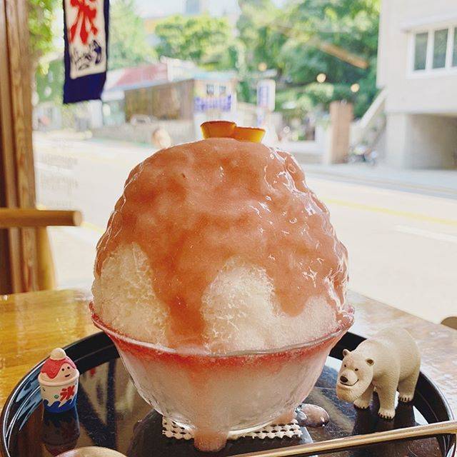桃のかき氷🍑。 練乳氷と桃クリーム。