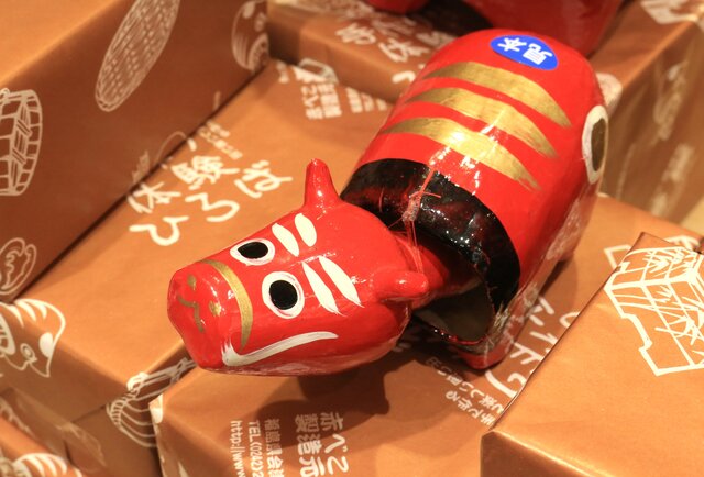 工芸品にとどまらず、貯金箱やポーチなど、現代的なアレンジが加えられた、赤だけでなく青や黄色などのカラフルな「べこ」たちも人気です。