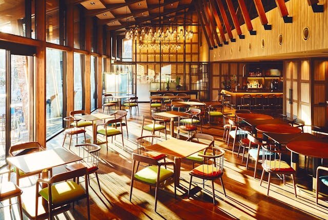 店内はガラス張りで天井が高く、解放感あふれる空間。長野県の木工作家が手掛けたオリジナルのテーブルとカウンターが並んでいます。