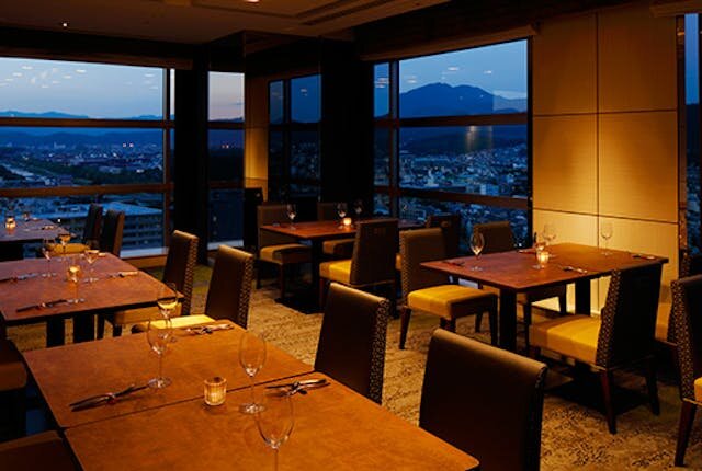 「オールデイダイニング 洛空」は、東山の夜景を眺めながらディナーブッフェを楽しめるレストラン。広々とした店内はベージュを基調とした空間で、ゆったりとくつろげる雰囲気です。
