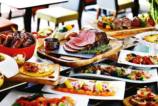 ブッフェでは牛サーロインステーキや、ピッツァなどの窯焼き料理が並びます。そのほかにも、おばんざいやアジアンフードなど、幅広いメニューを堪能できます!