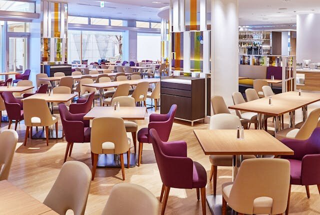 「ル・プレジール」は、京都の伝統織物や唐紙の装飾が目を惹くレストラン。明るい木目調をベースに、紫色がアクセントとして映える内装です。