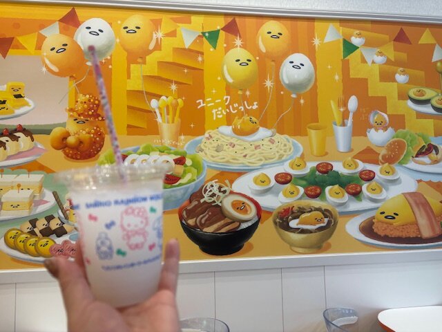 かわいいサンリオキャラクターのカップに入れてもらえるソフトドリンクを頼んで、ぐでたまエリアで一息つくだけで癒されます。