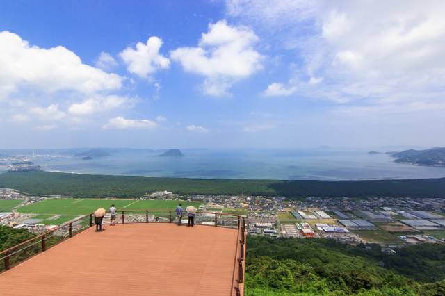 佐賀県唐津市の人気ビュースポット「鏡山展望テラス」は虹の松原、唐津城、唐津湾の絶景を一度に見渡せる場所。海の青色と松の緑色が素晴らしいコントラストを生み出し、美しい色合いを目にすることができます。