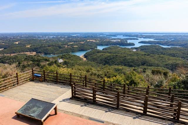 伊勢志摩国立公園内にある「横山展望台」は絶景を望める天空テラスとして有名。ミシュランでひとつ星を獲得した横山からは、英虞湾に広がるクリアブルーの海と、点々と浮かぶ小島の景観美を楽しめます。