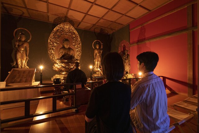 宿坊から徒歩1分の収蔵庫で行う、鎌倉時代の武士が祈ったようにろうそくの明かりだけで拝観する「暗闇参り」は非日常感抜群!