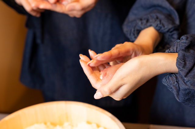 「寿司料理教室」では、目で見て触れて味わい、五感をフルに活用して楽しめます。