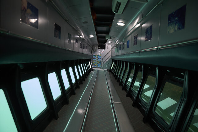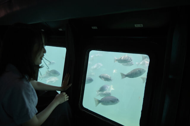 大きな窓からはエメラルドグリーンの海中世界が広がり、たくさんの魚たちが自由に泳ぎ回る様子を間近で観察できます。