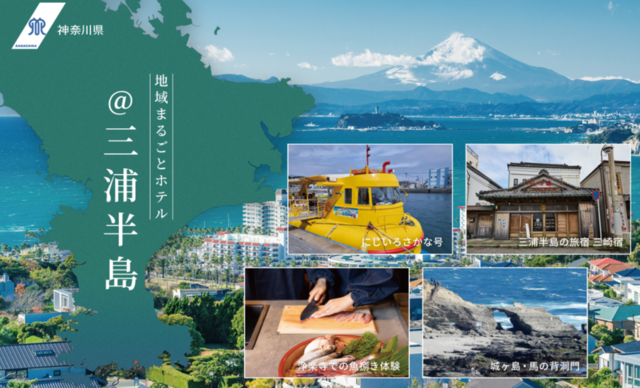 「地域まるごとホテル@三浦半島」とは三浦半島内の宿泊施設、飲食店、観光施設などが連携し、地域全体を一つのホテルと見立てて、体験型のパッケージプランを提供する神奈川県が推進する新しい観光スタイル。