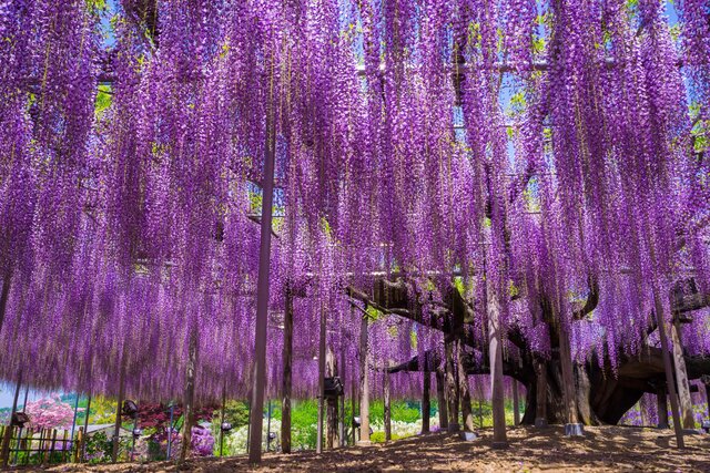 春に藤の花が咲き誇る関東屈指の花絶景スポット。4月下旬から5月中旬にかけて、約9万4,000m2の園内が藤色に染まり、幻想的な景色が広がります。