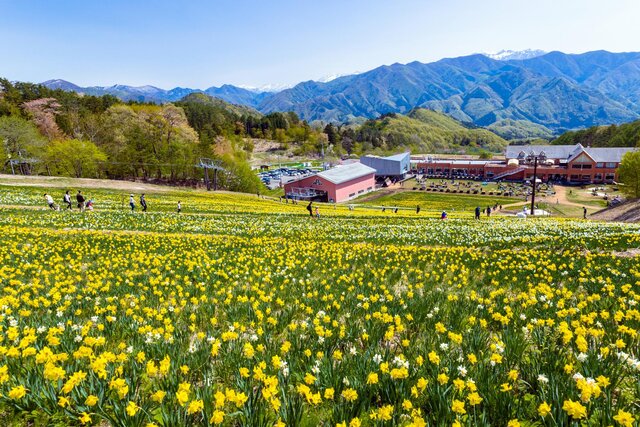 4月中旬頃から開催される「すいせんまつり」前期には鮮やかな黄色のスイセン、GW前後には白く香り高いスイセンが見頃に。一面に広がる花畑と、鳥のさえずりや高原の爽やかな風が相まって、心までリフレッシュできる癒やしの景色が広がります。