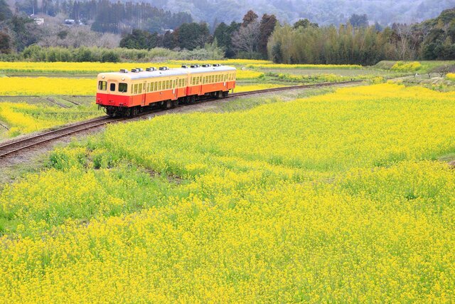 関東屈指の菜の花スポットとして知られる小湊鉄道。春になると沿線一帯が黄色い菜の花に包まれ、レトロな電車が走り抜ける、季節限定の絶景が広がります。