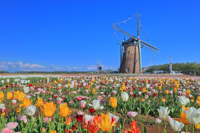 毎年4月に開催される「佐倉チューリップフェスタ」の会場である佐倉ふるさと広場。オランダ風車を背景に、約80種類・55万本ものチューリップが咲き誇り、関東屈指の春絶景として人気を集めています。