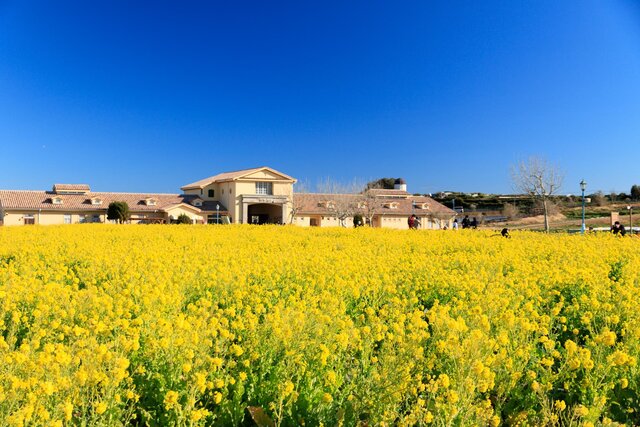 相模湾を望む開放的なロケーションが魅力の花スポット。春は菜の花やネモフィラ、初夏にはポピーなど、季節ごとに色とりどりの花が園内を彩ります。