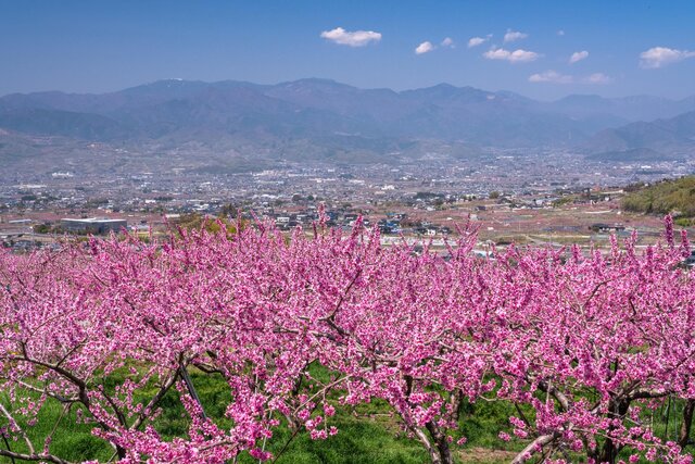 春の山梨を代表する花絶景といえば「笛吹桃源郷」。3月下旬〜4月上旬にかけて、広大な果樹地帯一帯が桃の花で淡いピンク色に染まり、のどかな春景色が広がります。