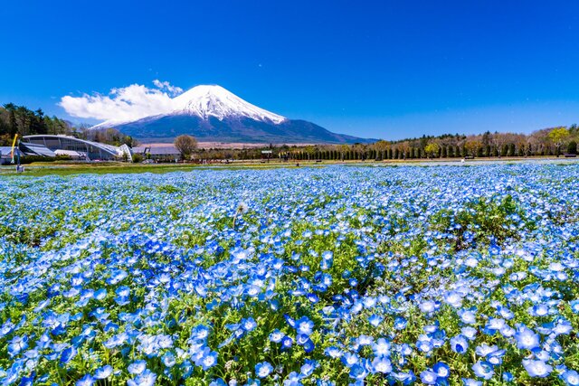 特に人気なのが、5月上旬〜6月中旬に見頃を迎えるネモフィラ。可憐な青い花が一面に咲き、雄大な富士山との共演はまさに圧巻の景色です。時期によってはチューリップやポピーも楽しめます。