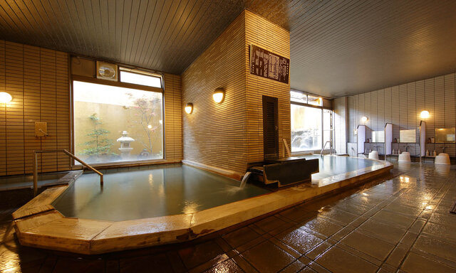 地下1階には源泉かけ流しの大浴場と露天風呂があり、サウナも併設。