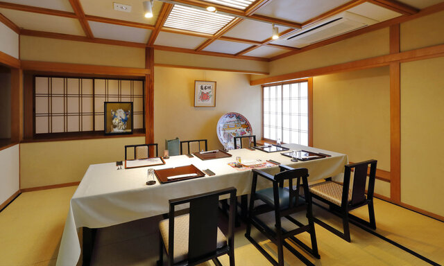 数寄屋造りの落ち着いた空間「島津藩」と、華やかなピンクの絨毯が印象的な「四季彩」があり、どちらもプライベートな空間でゆっくりと食事を楽しめます。