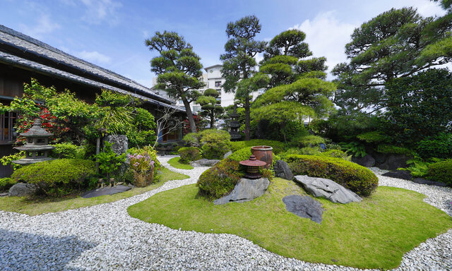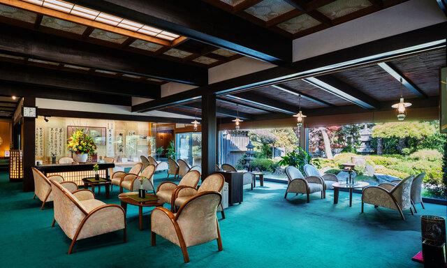 靴を脱いで上がる畳敷きのロビーからは心和む枯山水の日本庭園が望めます。