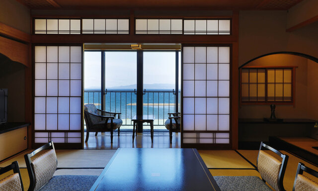 「和洋室 鶴丸の間」は、島津の棟の最上階に位置、海側に面しており、バルコニーからは美しい海の景色を楽しめます。
