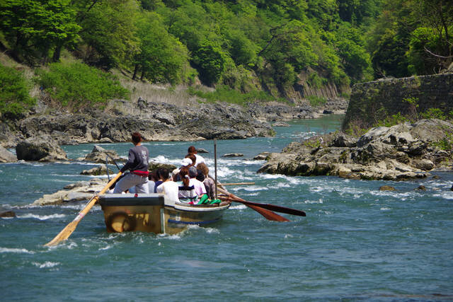 丹波亀岡から嵐山までの約16kmもの川下りが楽しめる「保津川下り」。