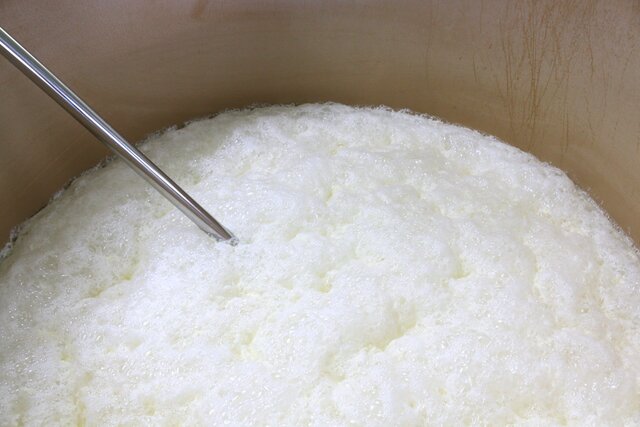 糀、水、蒸された米と酵母を全て加え、酒の元を作ります。