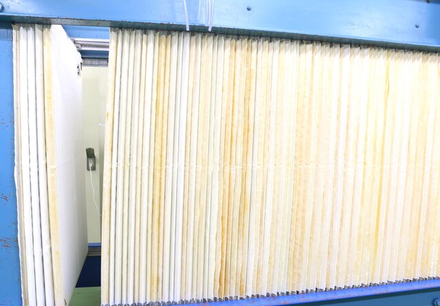 このアコーディオンのような機械はその分類する機械で、酒粕はこの布板の部分に張り付くそうです。