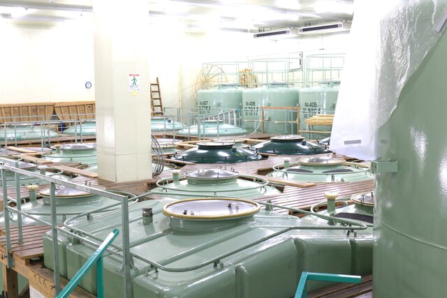 酒母に、蒸米、米麹、水を3回に分けて加えて、タンクの中で約25日発酵させます。