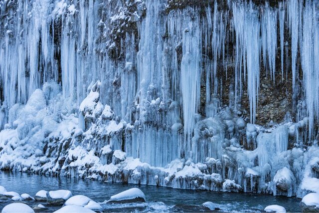 「白川氷柱群」は、長野県南部・木曽御嶽山の麓で見られる冬の絶景。広範囲にわたる氷柱群は全国的にも珍しく、この地ならではの自然の造形美を堪能できます。