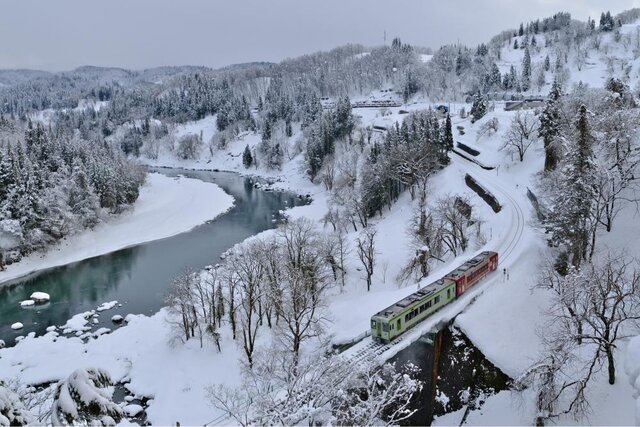 「おいこっと」は、JR飯山線の長野駅~十日町駅間を走る臨時快速列車。千曲川沿いに広がる風景を眺められ、穏やかな時間を過ごせます。列車名も東京とは反対という意味が込められ、「TOKYO」を逆にした「OYKOT」と名付けられました。