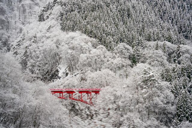 冬になると雪に包まれた松川渓谷の中に赤い橋が映え、水墨画のような風景が広がります。時刻によっては橋の上をバスが通ることもあるので、ぜひシャッターチャンスを狙ってみてください♪